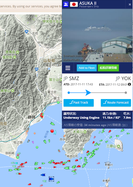 過去の事例として2017年11月11日08:00に清水港に入港した客船「飛鳥Ⅱ」は予定では同日17:00に横浜へ向け出港となっており、ライブ船舶マップにて確認をする事が出来ました。